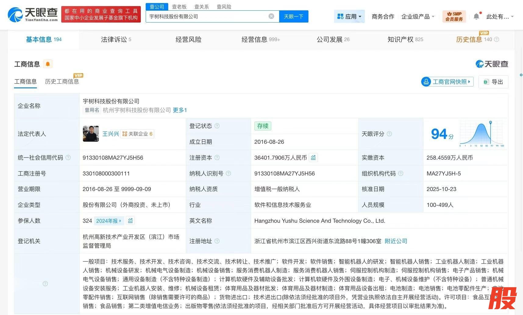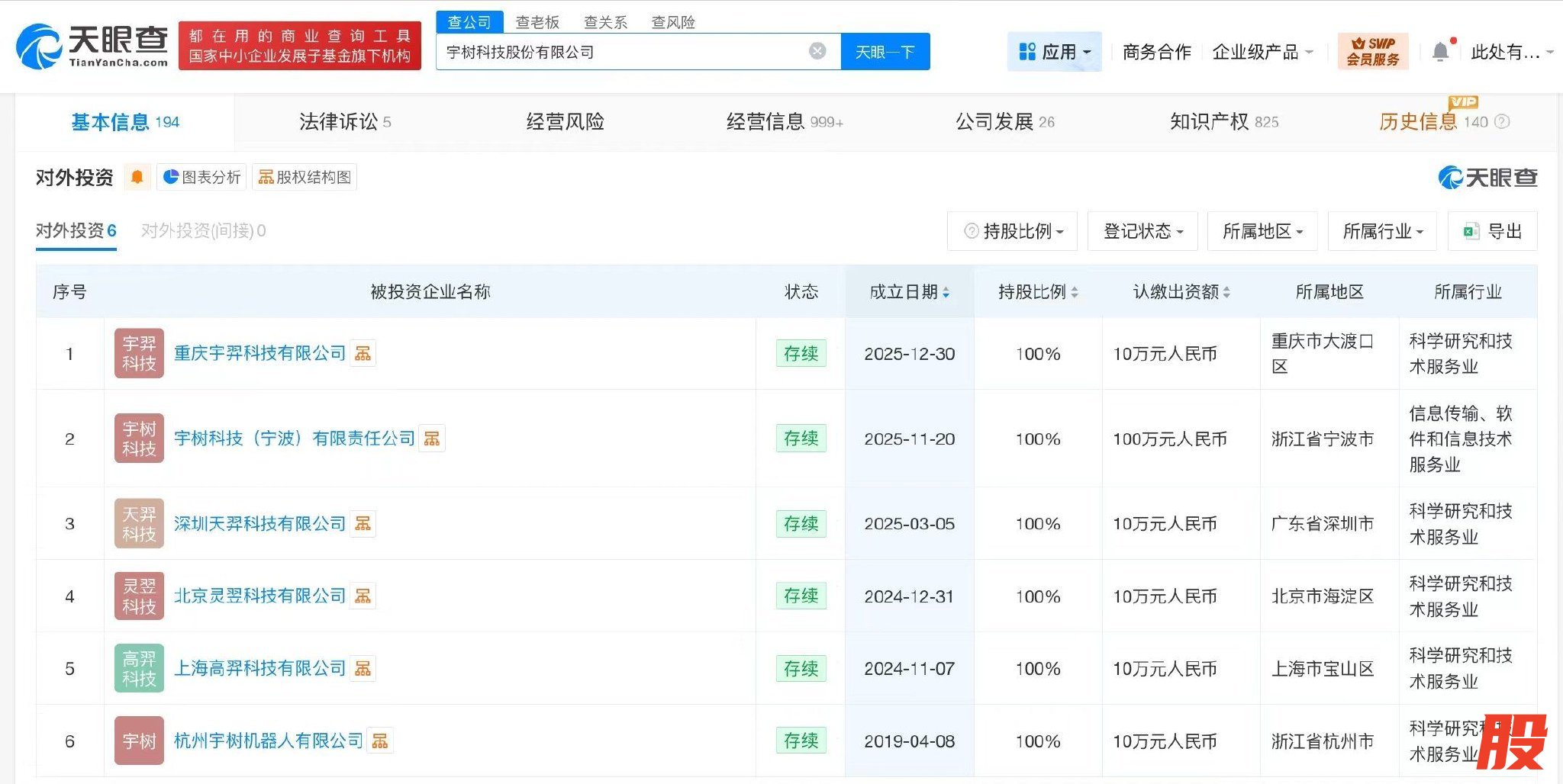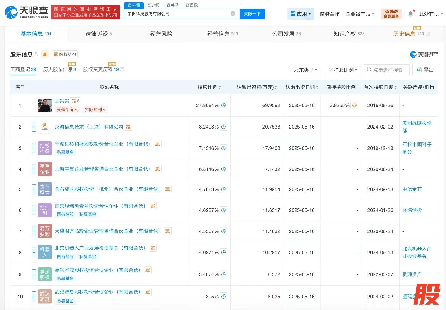 天眼查工商信息显示,宇树科技关联公司宇树科技股份有限公司成立于2016年8月,法定代表人为王兴兴,注册资本约3.64亿人民币,经营范围含软件销售、智能机器人的研发、智能机器人销售、工业机器人制造、工业机器人销售、机械设备研发等。股东信息显示,该公司由王兴兴、汉海信息技术(上海)有限公司、宁波红杉科盛股权投资合伙企业(有限合伙)、上海宇翼企业管理咨询合伙企业(有限合伙)等共同持股。对外投资信息显示,该公司在内地直接持股6家企业,均为存续状态。值得一提的是,2025年以来,宇树科技已成立多家新公司,包括重庆宇羿科技有限公司、宇树科技(宁波)有限责任公司、深圳天羿科技有限公司。此外,该公司已多次增资并多次更名。