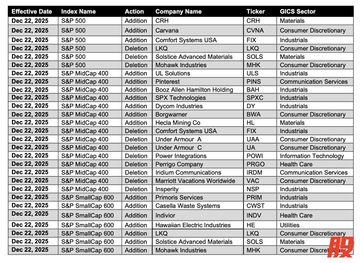 标普道琼斯指数公司当地时间12月5日宣布,将于12月22日(周一)开盘前对标普500指数、标普中盘400指数及标普小盘600指数实施以下调整,以配合季度再平衡操作。本次调整旨在确保各指数更能代表其对应的市值区间。被移出标普小盘600指数的公司已不再具有代表性。